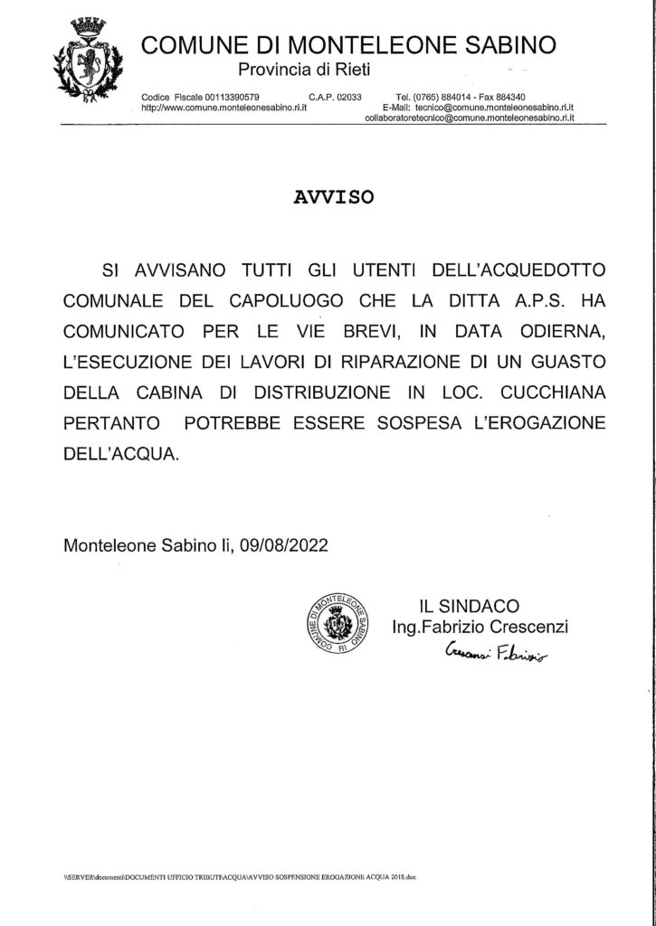 Si avvisano tutti gli utenti dell’acquedotto comunale del capoluogo che la ditta A.P.S. ha comunicato per le vie brevi, in data odierna, l’esecuzione dei lavori di riparazione di un guasto della cabina di distribuzione in loc. Cucchiana pertanto potrebbe essere sospesa l’erogazione.